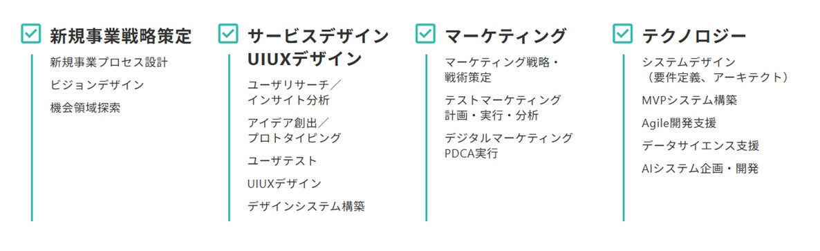 携帯電話や車載器などの開発で培ったエンジニア力に、サービスデザインとマーケティングの専門知識を+(プラス)し、お客様企業の事業パートナーとして、新規事業アイデアの創出からシステム開発、事業拡大まで一気通貫で伴走支援を行っております。