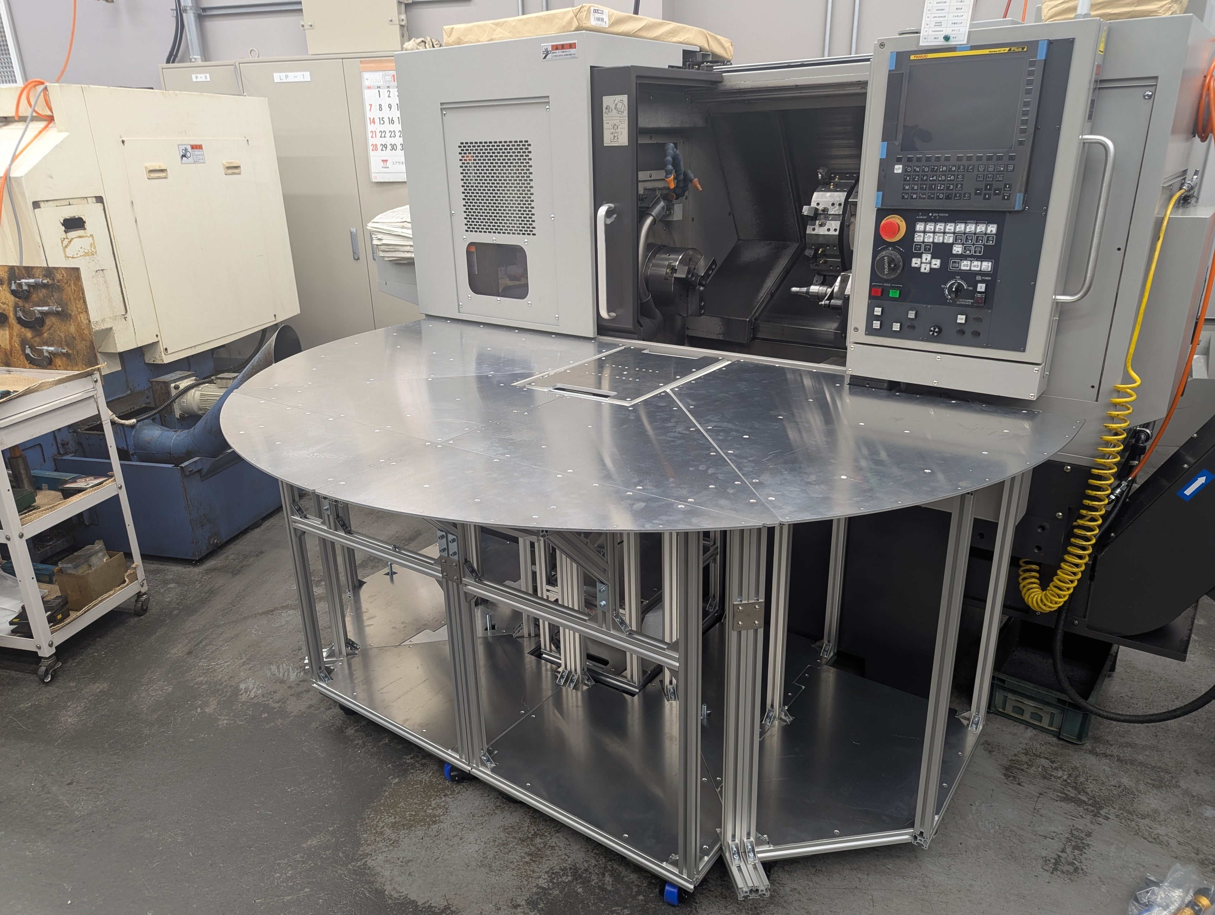 協働ロボットの可動域に合わせた架台・レイアウトにより、既存設備に組み込みやすい省スペース設計。必要なときに持ち込める運用も想定。