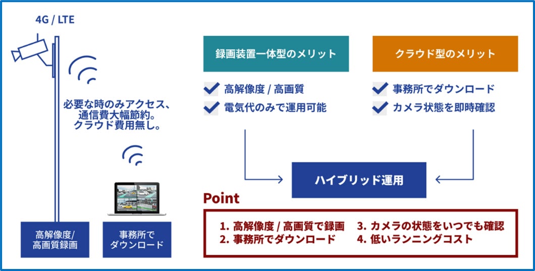 高画質録画と遠隔操作(データダウンロード・カメラ状態の確認)を同時に実現できる次世代型街頭防犯カメラ。従来の街頭防犯カメラ(録画装置一体型)は、高画質な映像を録画できるものの、カメラ内にデータが録画されているため現地でダウンロードする必要がありました。また、近年主流になりつつある遠隔操作ができるカメラ(クラウド型)は、離れた場所の映像をいつでもダウンロード、確認することができます。その一方で通信料やクラウド利用料が発生するため、ランニングコストの負担が課題となっておりました。