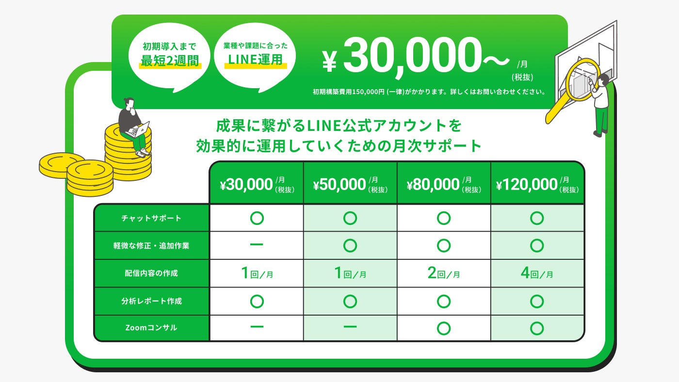 LPROは1社1名の専任担当制でありながら、月額3万円〜という“高品質かつ低価格”というLINE運用代行サービスを実現しました。