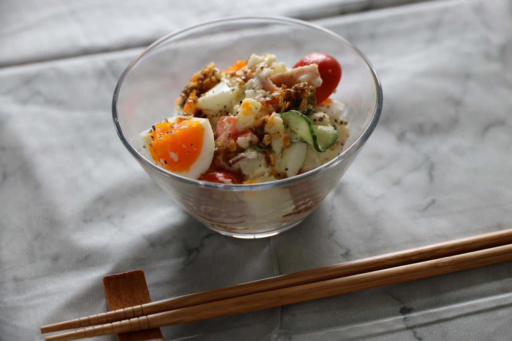 2.ポテトサラダにトマト、ゆで卵、食べるオリーブオイル、ブラックペッパーを入れ混ぜたら完成
