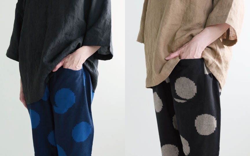 「MONPE」は、福岡・筑後地方に伝わる伝統織物・久留米絣を使った、現代的なもんぺです。昔ながらのシャトル織機で織られる生地は、手織りに近い柔らかさと風合いが魅力です。うなぎの寝床は、この素材を生かし、かつての農作業着だったもんぺを日常着として再提案しています。アメリカのジーンズのように、MONPEも日本発の定番服として注目されています。