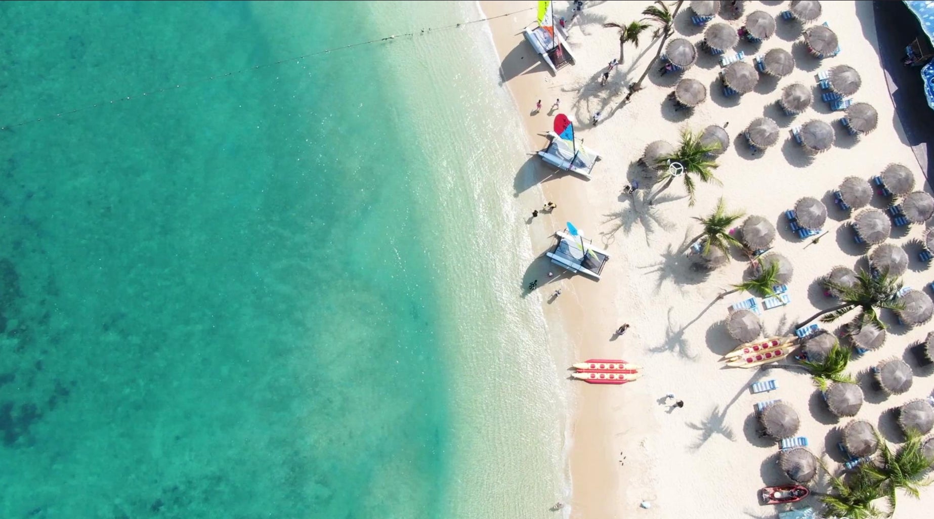 ターコイズブルーの海、広がる白い砂浜、南国の風を受けるパームツリー。