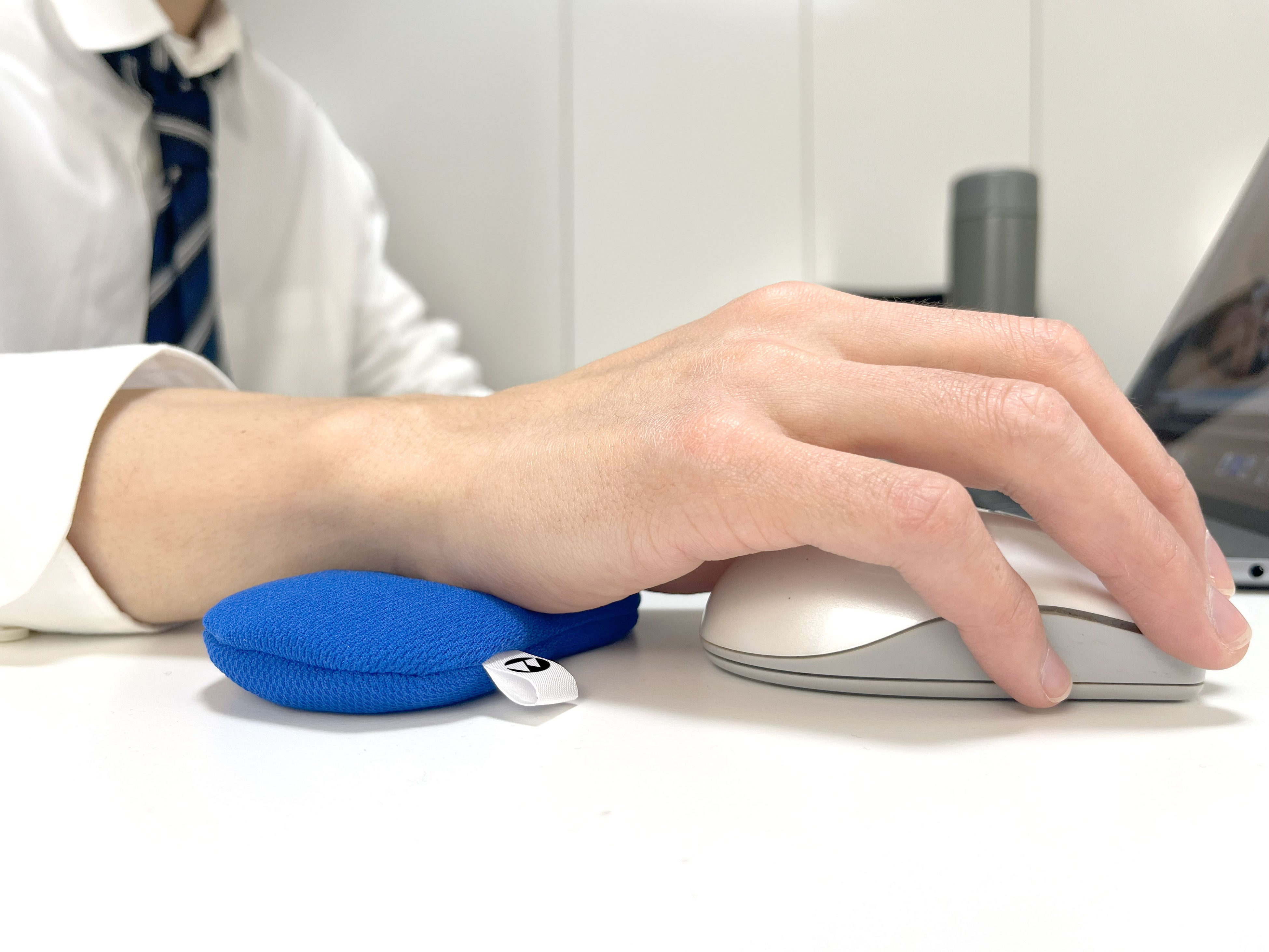 にぎりざんまいは、握るだけでなく、手元に置いてリストレストのような手首を支える使い方も可能です。また、商品上部に付いているタグに、カラビナやボールチェーンなどを取り付ければ外出時にぶら下げて携帯することもできます。筆記やデスクワーク、人と接する場面など、さまざまなシーンでの活用が期待されています。