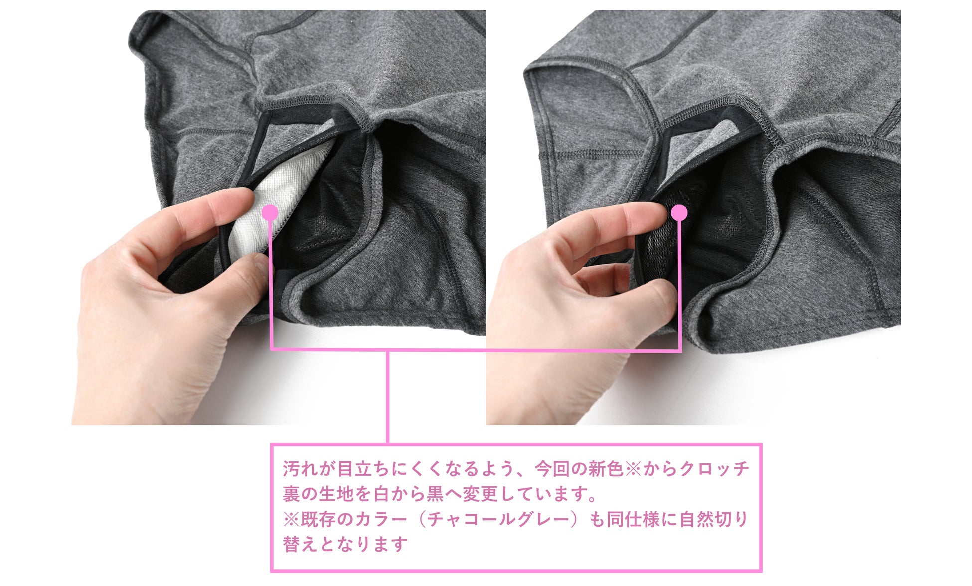 また、汚れが目立ちにくくなるよう、今回の新色※からクロッチ裏の生地を白から黒へ変更しています。