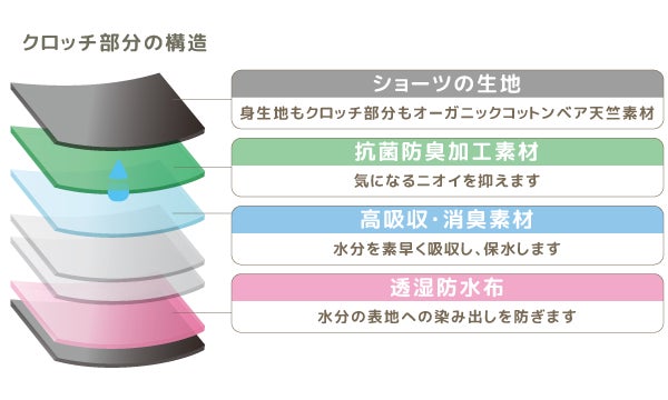 クロッチ部分は約45㏄の水分吸収が可能です。クロッチ周りを防水布で囲って縫っており、アウターへの水分の染み出しを防ぎます。