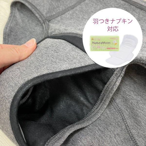 吸水ショーツのクロッチ部分は、羽がしまえる二重構造です。羽がしまえるため、羽つきナプキンと併せてお使いいただけます。