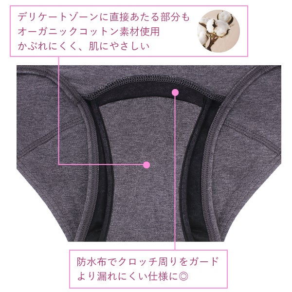 クロッチ内部に抗菌防臭加工を施した素材をクロッチ内部に使用しており、気になるニオイも抑えます。軽い尿漏れ対策としてもお使いいただけます。
