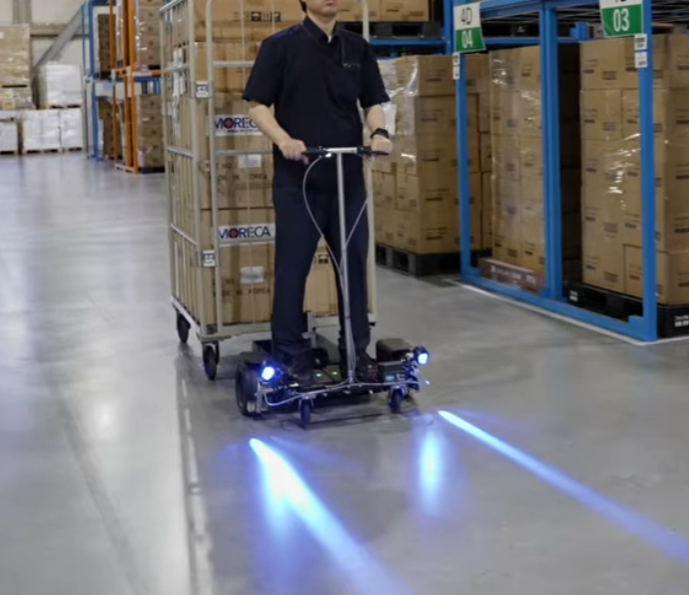 歩くことなく搬送を可能に:台車に「乗る」事で性別、国籍問わず幅広い方の「歩行」を大幅軽減。現場環境の向上と同動速度向上に伴う生産性向上へ繋げます。搬送速度上限は7km/10kmよりお選び頂けます。
