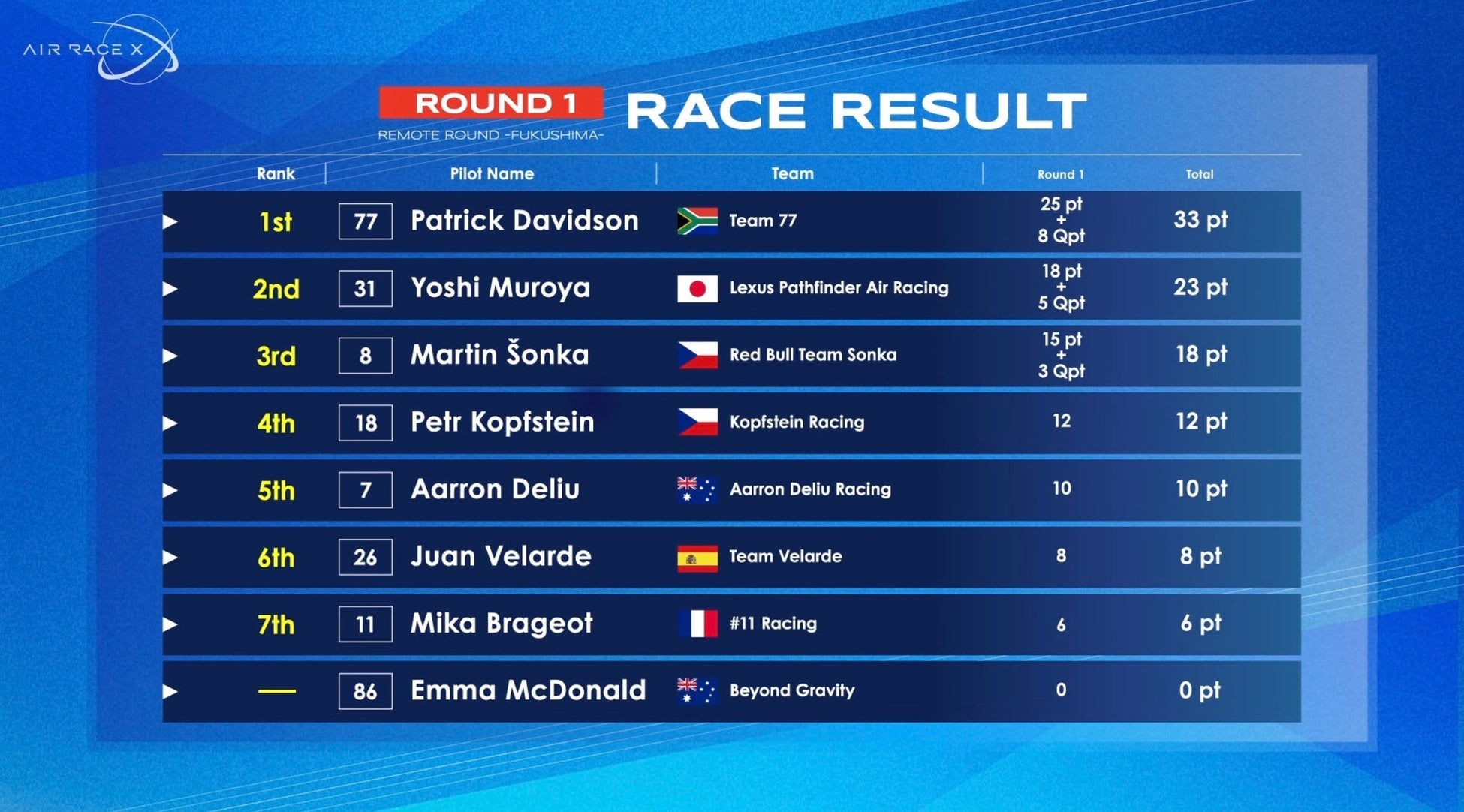 一方、昨年のシリーズチャンピオンである日本の室屋義秀選手(LEXUS PATHFINDER AIR RACING)は2位(23pt)でフィニッシュ。年間王者連覇に向けて、これ以上ポイント差を広げられない正念場を迎えています。