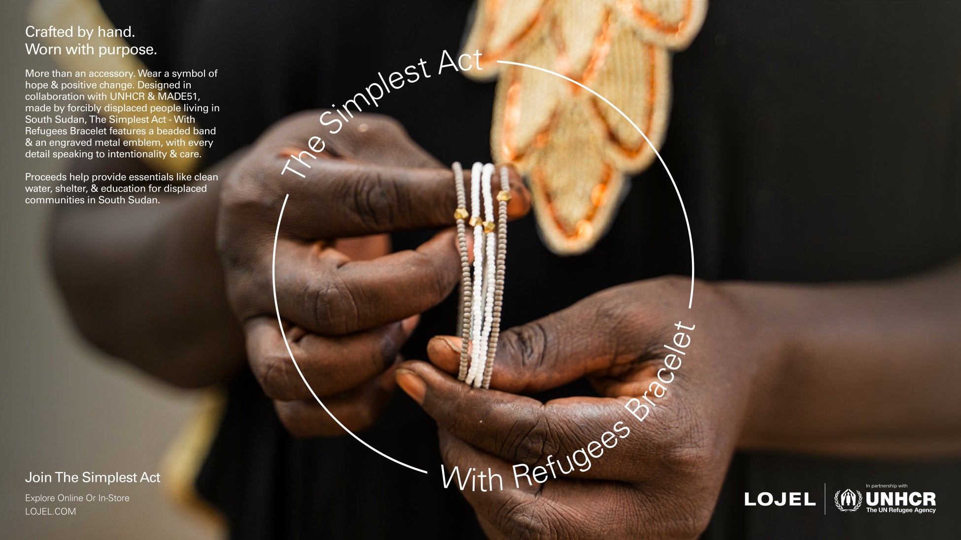 (日本、2025年7月15日) – 現代的なスーツケースやデイリーユースのバッグ製品を提供するグローバルブランド、LOJEL(ロジェール)は、国連難民高等弁務官事務所(UNHCR)と新たに連携し、The Simplest Act キャンペーンを実施することを発表しました。このコラボレーションは、たとえささやかな意思表示であっても、難民等の尊厳と希望、主体性を取り戻すのに役立つことを広く紹介するものです。本キャンペーンの中心となるのは、南スーダンで暮らす難民と国内避難民であるアーティザン(職人)が手作りした、特別エディションのブレスレットの販売です。このシンプルなブレスレットは力強いメッセージを持ちます。