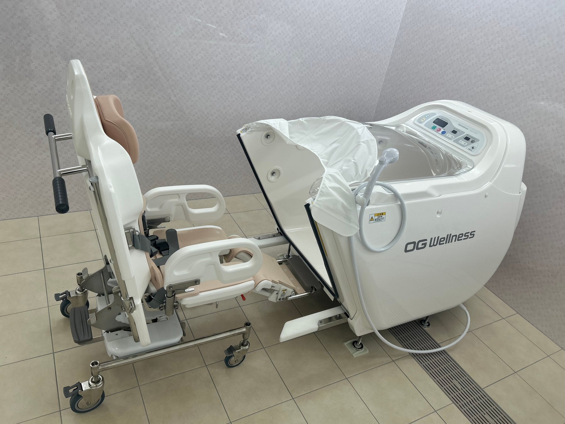 車椅子やストレッチャーのまま入浴可能なミスト風呂や、ウルトラファインバブルを活用した最新設備、座位で使えるオープン型シャワーなどを備え、利用者だけでなく、介助者にも優しい設計が特徴です。