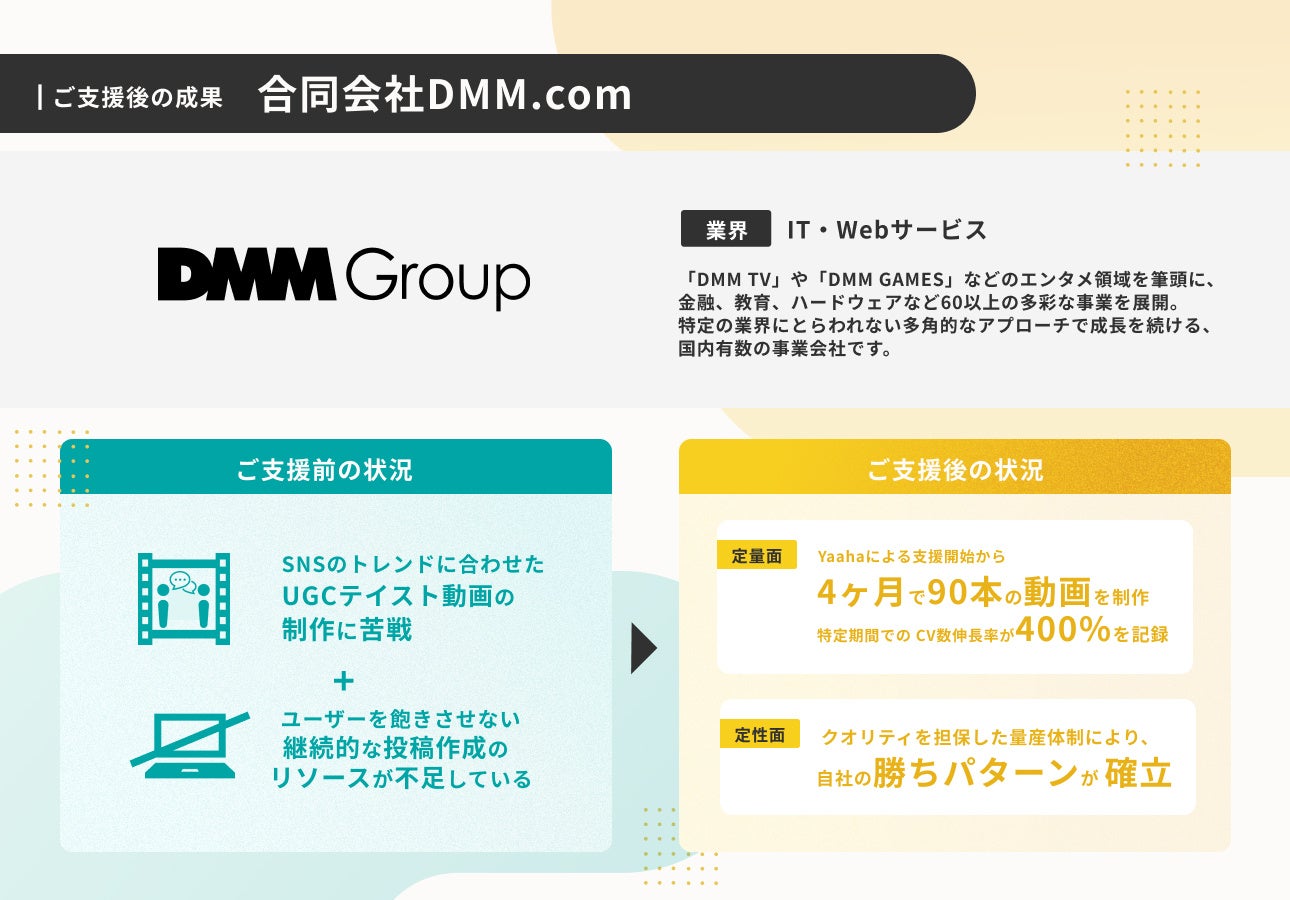 【事例紹介】DMM.com様|4ヶ月で90本の動画制作。完全成果報酬型ショート動画広告運用で、特定期間におけるCV数伸長率が約400%を記録