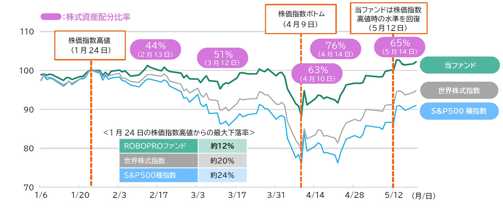 また、相場の下落局面で当ファンドは株式資産への投資配分を増やしたことなどが奏功し、5月12日に1月の高値を回復し、翌13日には設定来高値を更新しました。不確実性の高まる投資環境の中で、4月には臨時リバランスを行うなど機動的に資産配分の変更を実施しました。