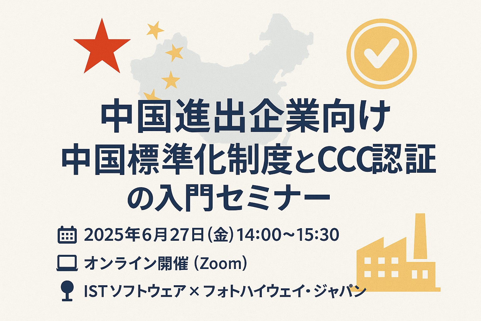 中国進出企業様向け「中国標準化制度と製品認証制度(CCC認証)概要(入門編)」Webセミナー:株式会社ISTソフトウェアと株式会社フォトハイウェイ・ジャパン共催で、2025年6月27日に開催予定