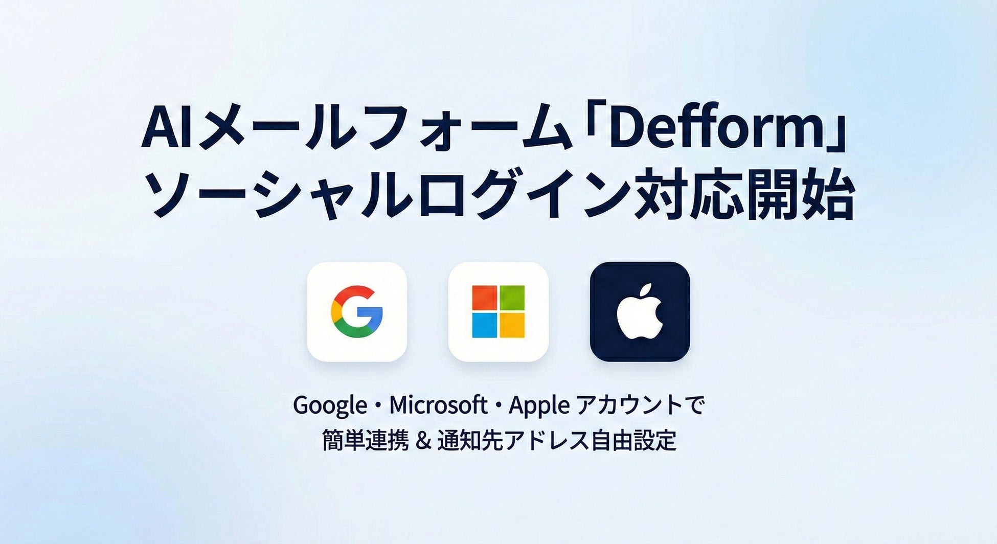 【利便性向上】AIメールフォーム「Defform」がソーシャルログインに対応。Google・Microsoft・Appleアカウント連携に加え、自由な通知先設定が可能に
