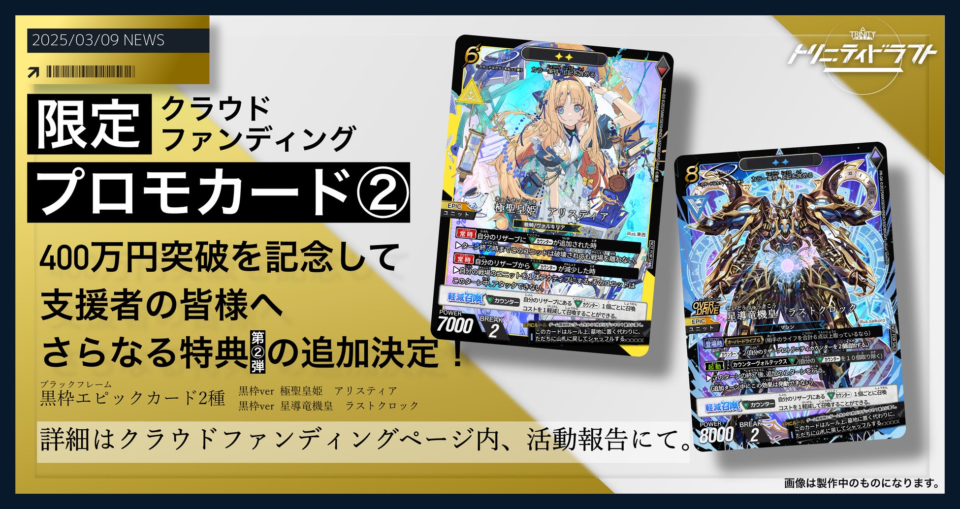 「トリニティドラフト」クラウドファンディングが400万円を達成したことを記念し、限定プロモーションカードの第二弾として、特別バージョンのプロモカード2枚を追加いたしました。今回のプロモカードは、ゲーム本体をご支援いただいた方々への完全限定アイテムであり、東西氏とsaikoro氏によるイラストを使用したカードの特別仕様となっております。詳細につきましては、クラウドファンディングページにてご確認いただけますので、ぜひご覧ください。