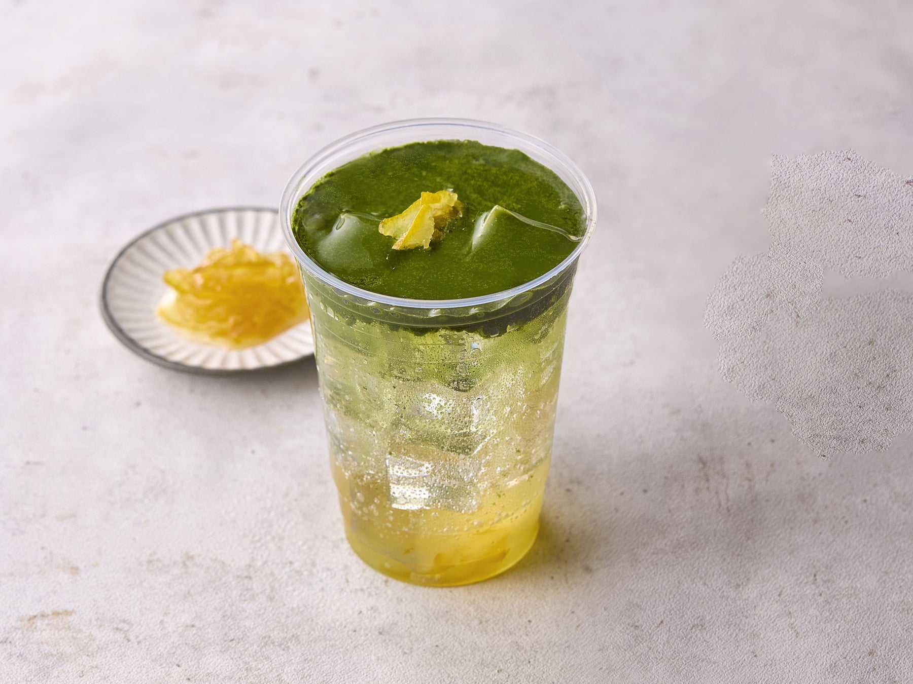 柚子とはちみつのソース、炭酸、蔵出し宇治抹茶の3層のコントラストが美しい、見た目にも涼やかなドリンクです。混ぜるたびに広がる、宇治抹茶の奥深い香りと柚子の爽やかな香りが愉しめます。仕上げにのせた柚子皮が、香りと見た目のアクセントに。すっきりとした甘さで、暑い季節にぴったりの一杯です。天ぷらと一緒に味わうのはもちろん、食後のドリンクとしてもおすすめです。