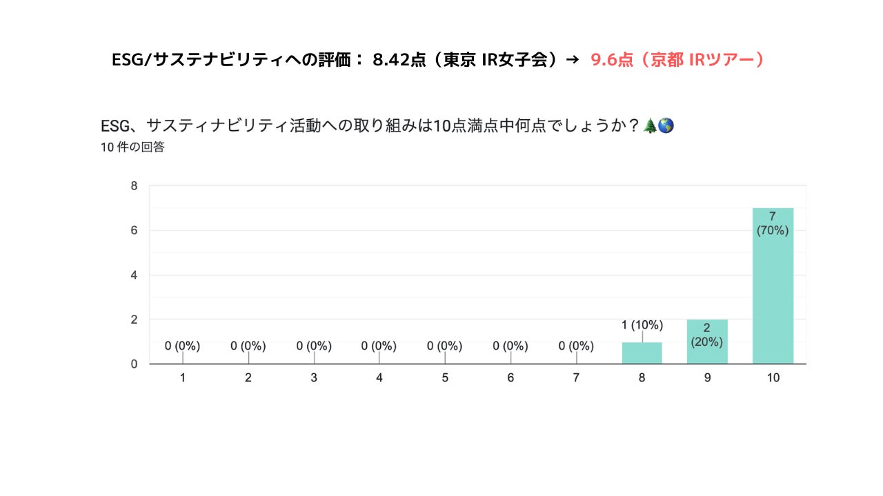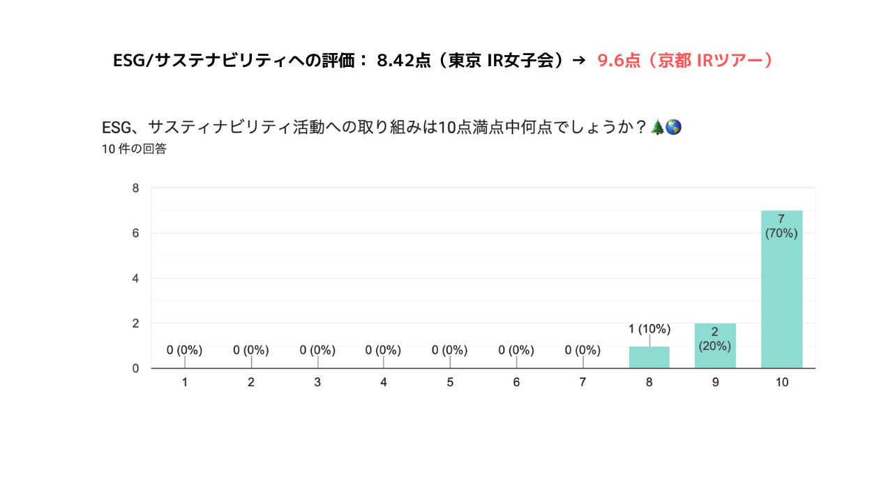 ESG/サステナビリティへの評価: 8.42点(東京 IR女子会)→ 9.6点(京都 IRツアー)