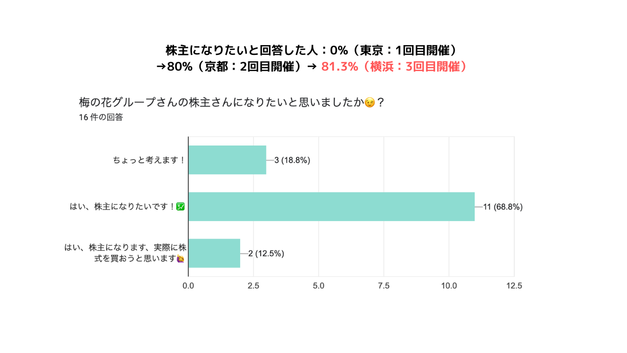 最後の株主さんになりたいと思いましたか?という質問では、なりたいという声が80%ではありましたが、実際にすぐに買おうと思います、というところまではまだ到達していないのも事実。