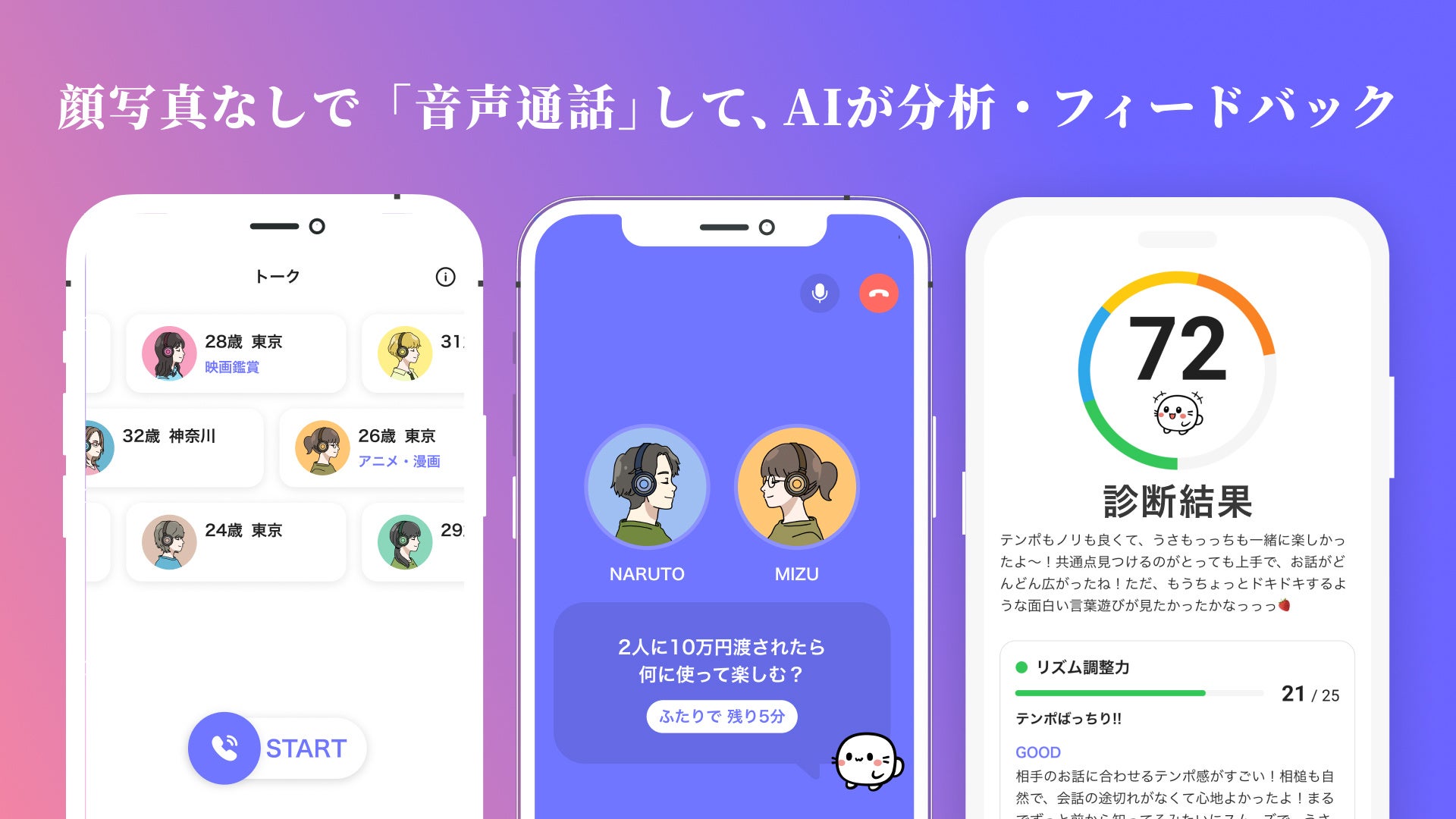 自動でマッチングされたユーザー同士が、顔写真なしに音声通話「のみ」を介してコミュニケーションを始められるアプリケーションに関する技術に関するもので、通話内容に対してAIが分析を行い、通話の概要や盛り上がりポイントなどをフィードバックするもの。
