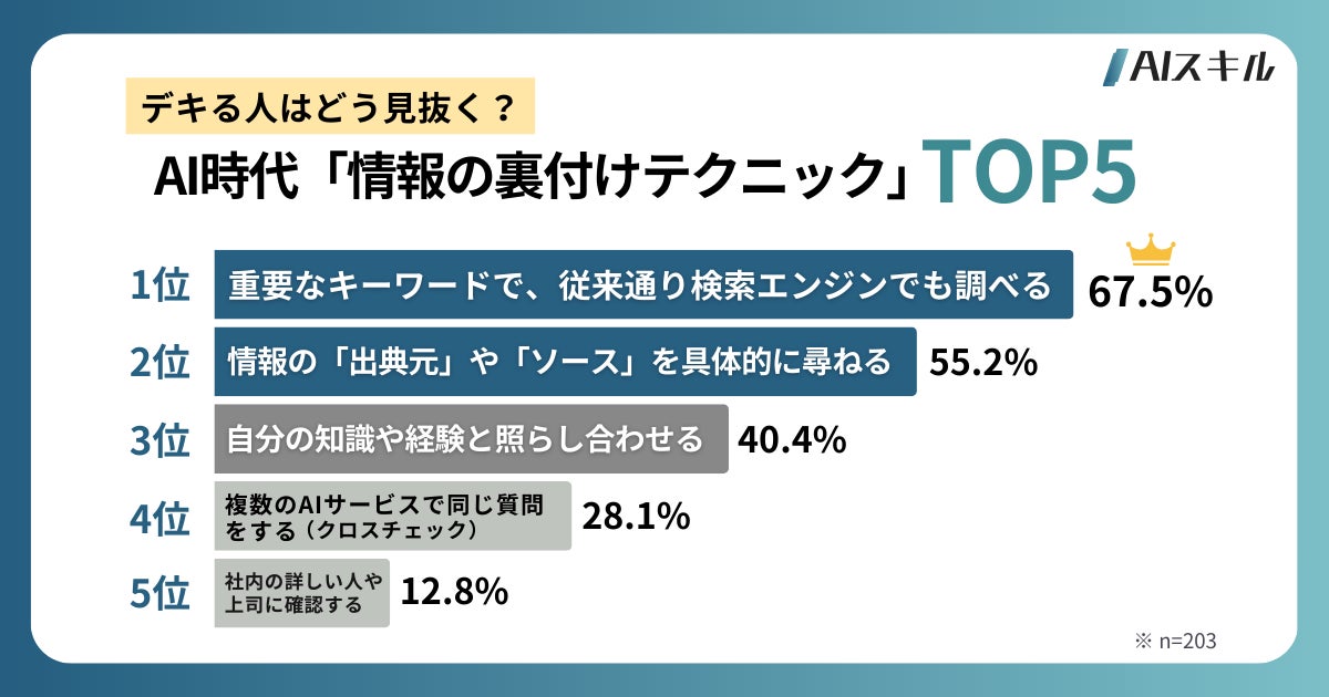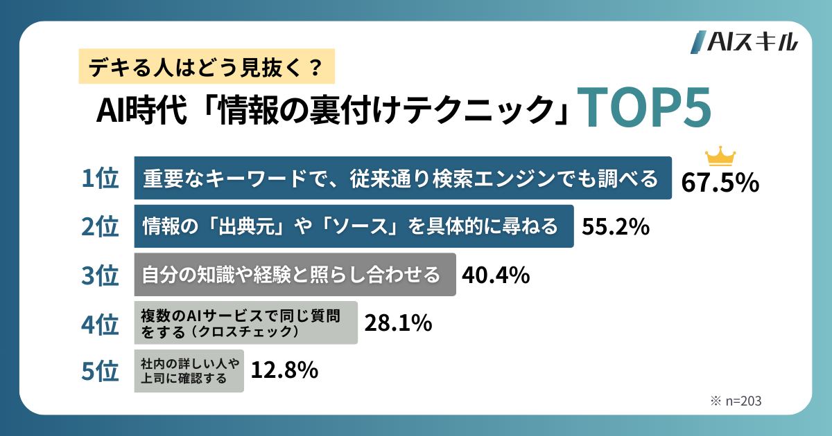 AIを導入した後も、従来の検索スキル(=Google検索での裏付け)が依然として最も重要な確認手段であることがわかります。