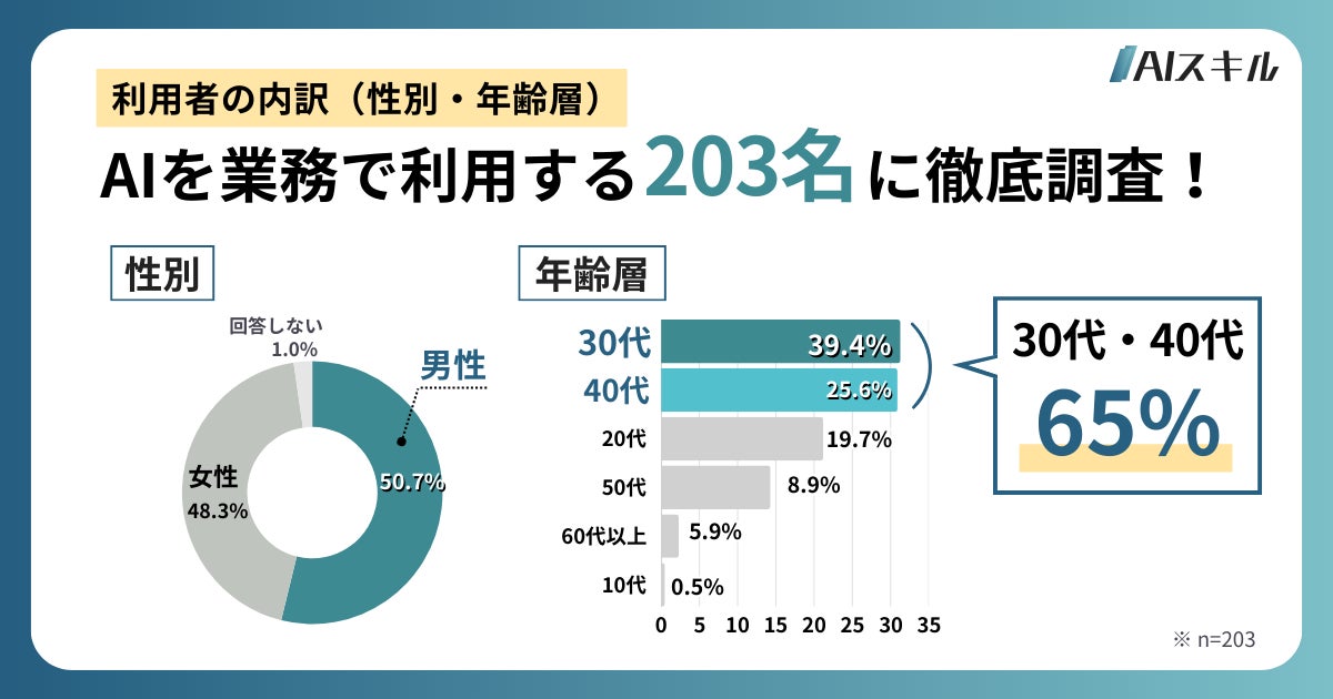 年齢層は30代(39.4%)と40代(25.6%)が合わせて65%を占め、性別も男性(50.7%)、女性(48.3%)とほぼ均等であり、働き盛りの中核層がAIを活用している実態がうかがえます。