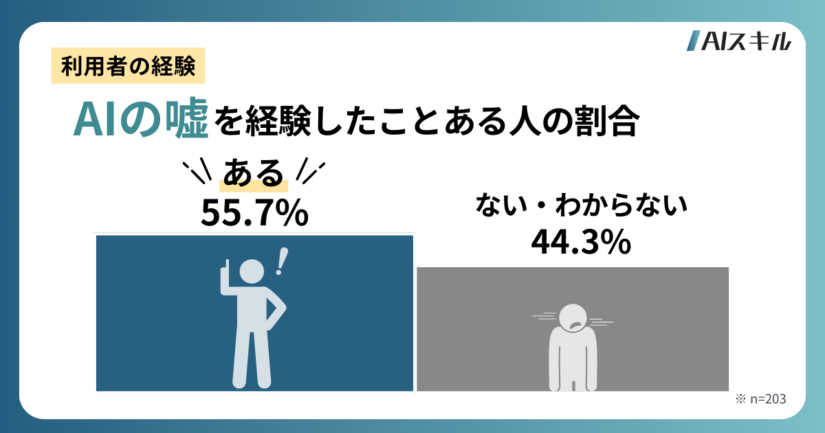 その結果、AI利用者のうち「AIの嘘を経験した」と明確に認識している人は55.7%に留まりました。