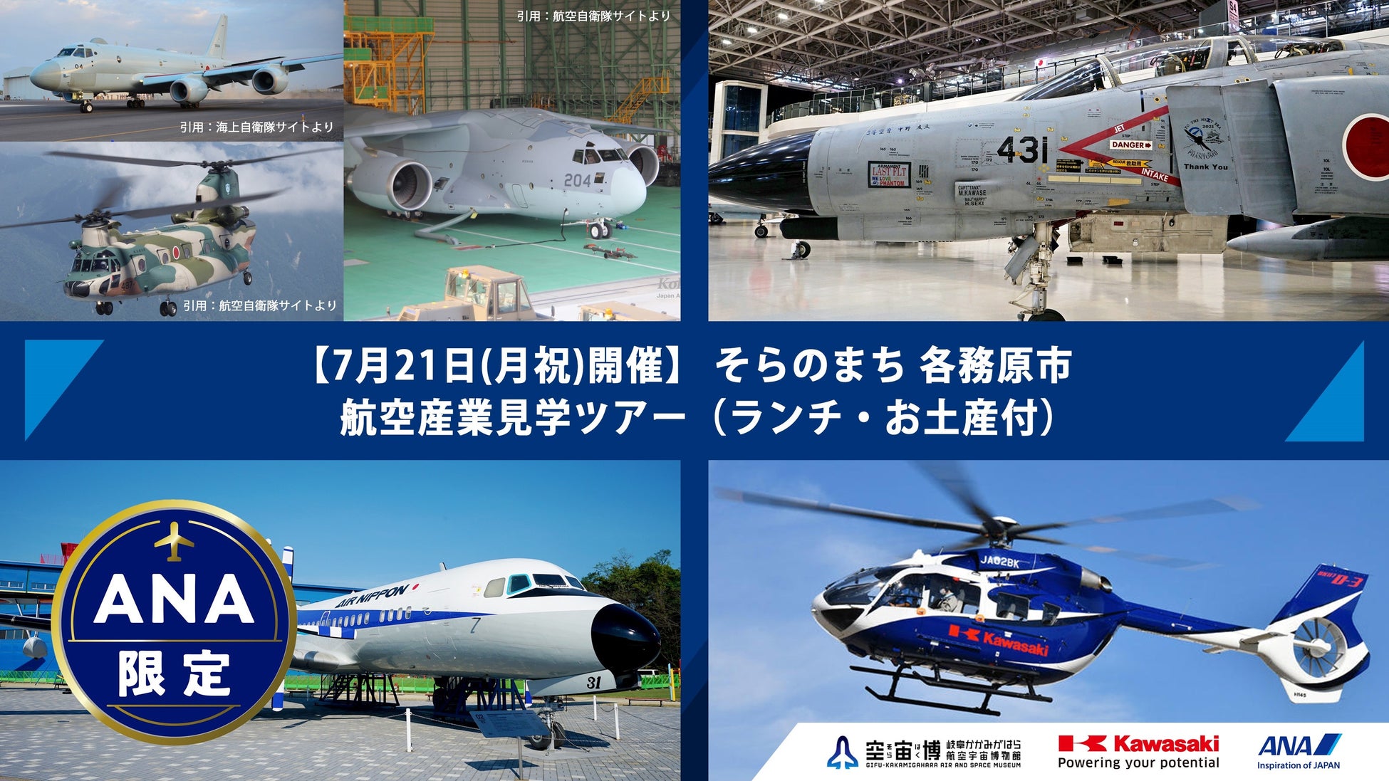 ANAあきんど株式会社およびANAグループ(以下、ANA)と川崎重工業株式会社(以下、川崎重工)、岐阜かかみがはら航空宇宙博物館(以下、空宙博/そらはく)は協力のもと、「ANAのふるさと納税」の限定返礼品として、【そらのまち 各務原市 航空産業見学ツアー】を登録しました。