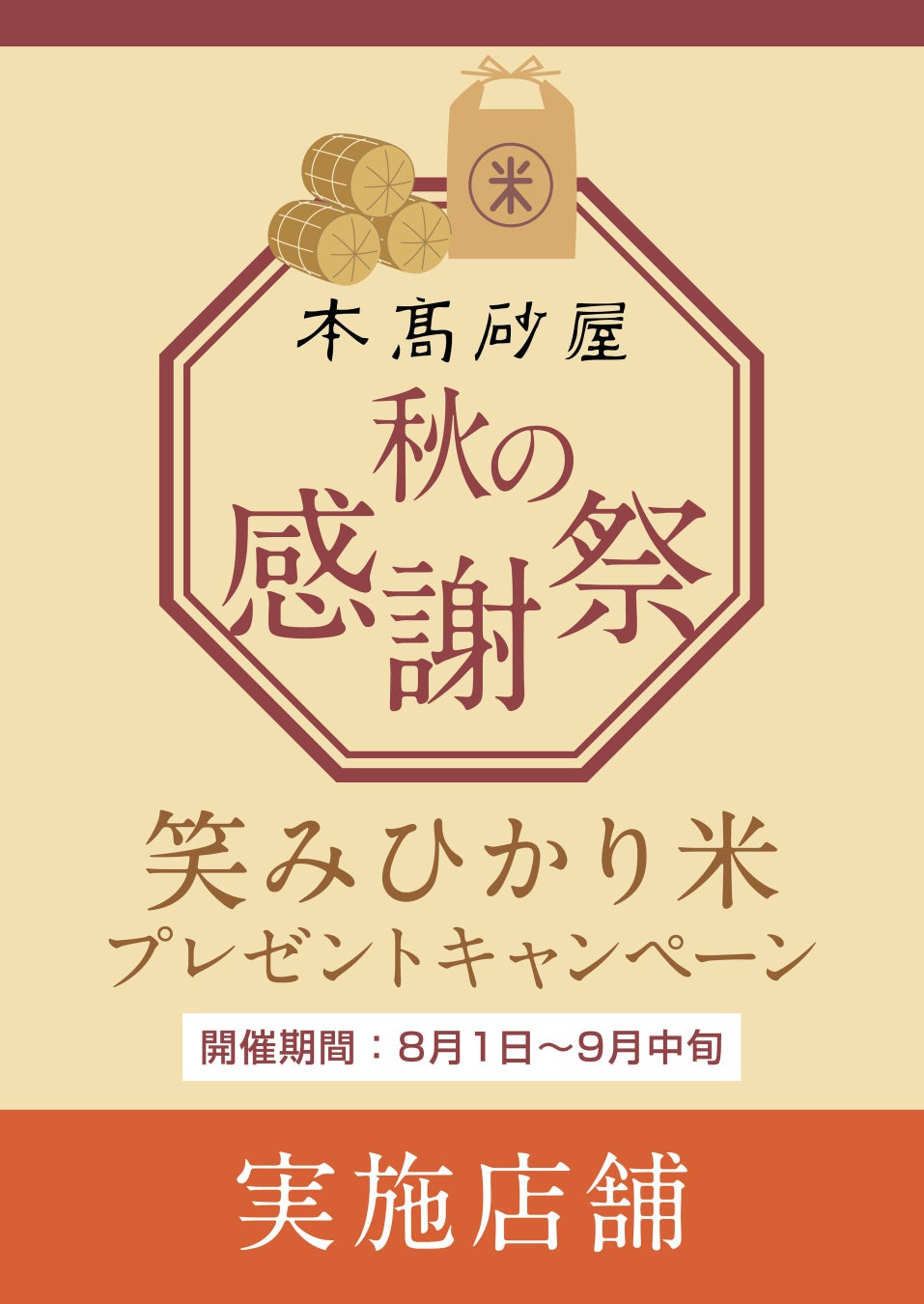 日頃のご愛顧に感謝して市場に出回る前の新米を、収穫から精米まで最短でお届けする、地域に愛され支えられた本高砂屋ならではの秋の訪れにふさわしい感謝祭です!
