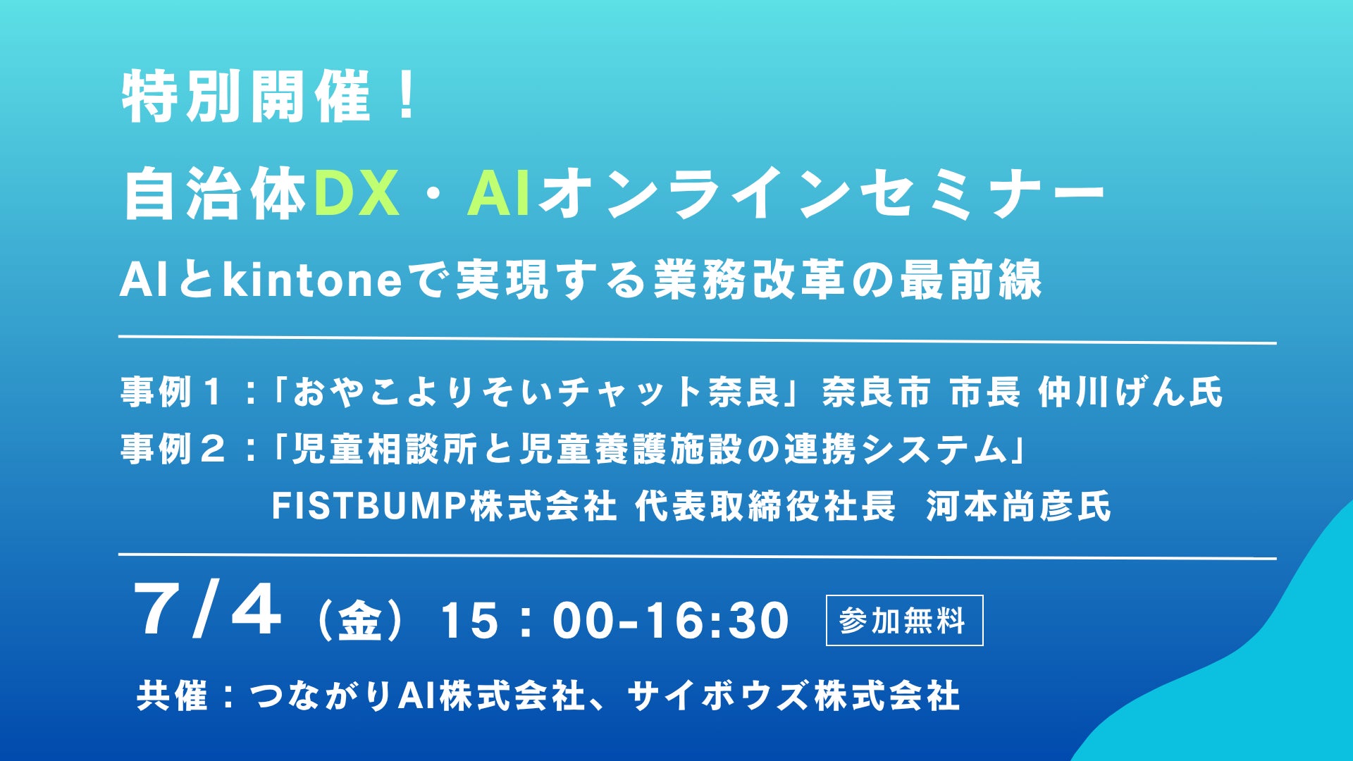 つながりAI株式会社(本社:東京都港区、代表取締役:駒崎弘樹)は、サイボウズ株式会社(本社:東京都中央区、代表取締役社長:青野慶久)との共催で、自治体職員向けのオンラインセミナー「【特別開催!自治体AI・DXオンラインセミナー】AIとkintoneで実現する業務改革の最前線」を2025年7月4日に開催することをお知らせいたします。