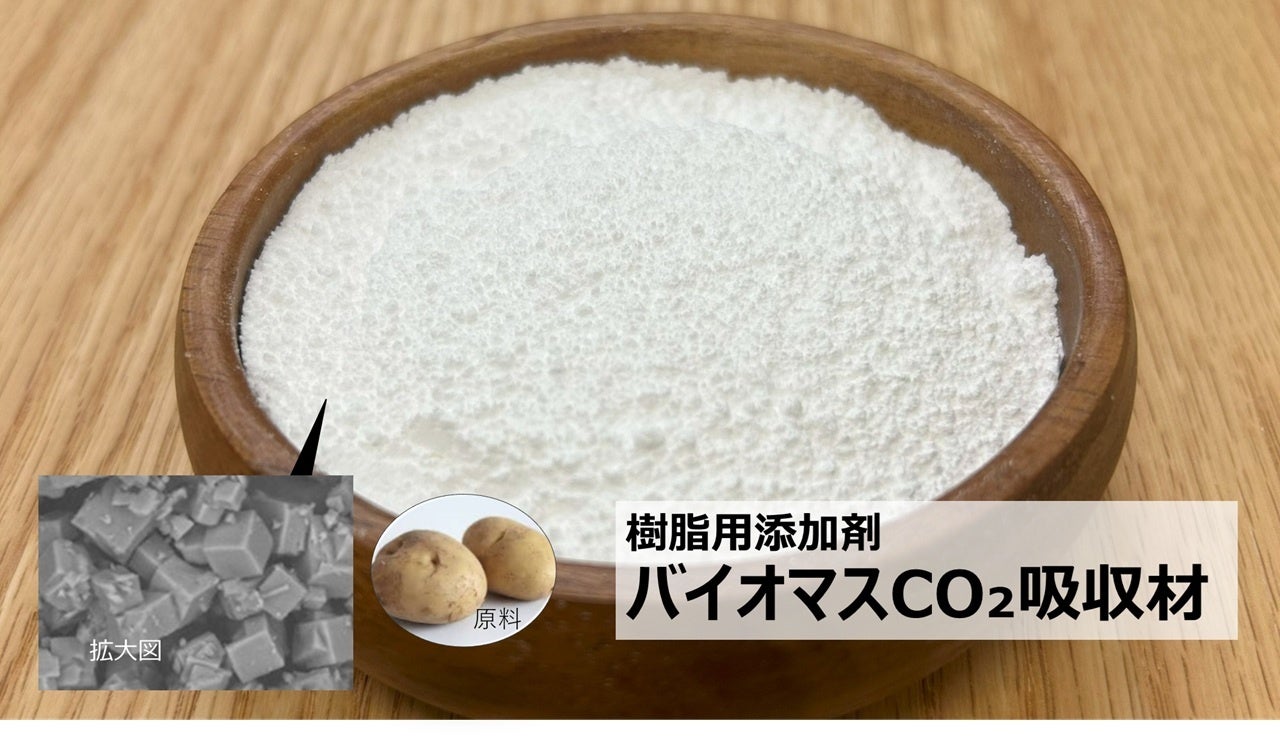 本粉末材料1kgで2Lのペットボトル25本分のCO₂を大気中から減らすことが出来る機能を持っています。