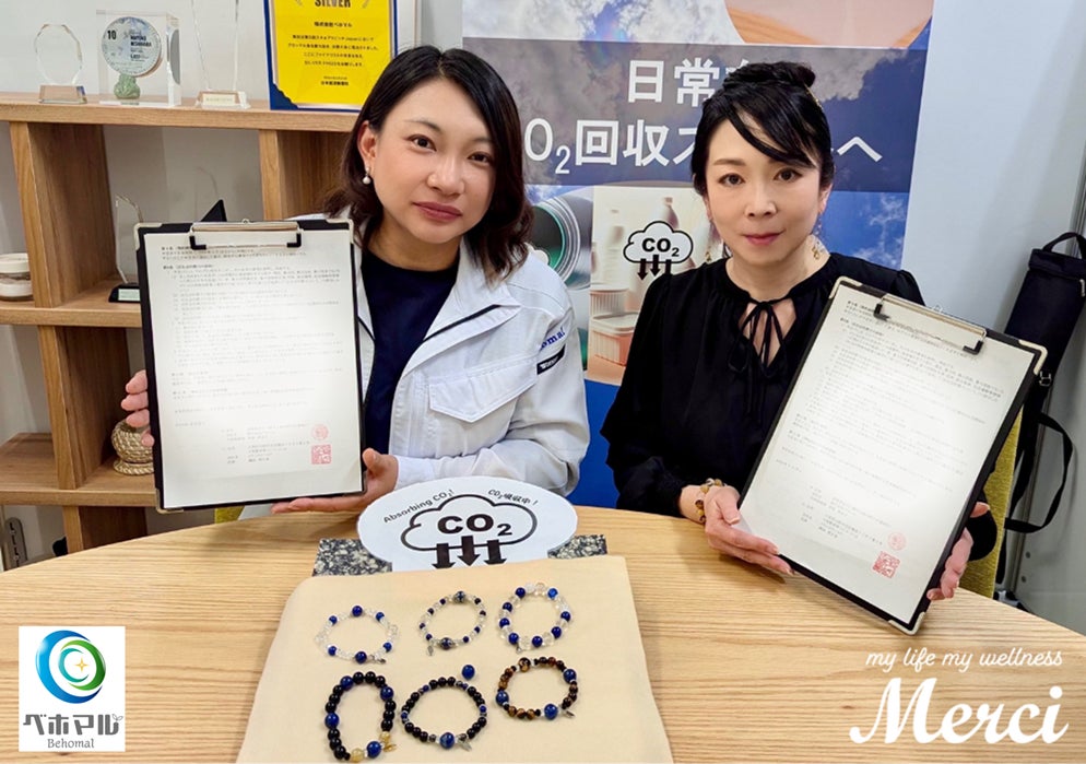 ジュエリーでウェルビーイングをサポートする【Merci Bracelet Jewelry~メルシーブレスレットジュエリー】(本社:大阪市北区梅田/TRANS WORLD代表:隅田あすか、以下「MBJ」)は、株式会社ベホマル(本社:滋賀県草津市、代表取締役:西原麻友子、以下「ベホマル」)の、CO₂吸収材「美環™(びのわ)」を配合した「Lazulith(ラズリス、以下「Lazulith」)」を製作しました。
