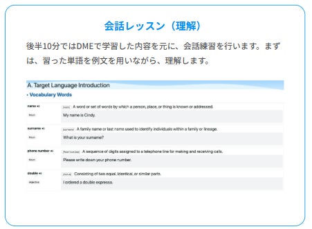 前半15分の通常のDME Standardレッスンに、後半10分の関連した内容の会話練習がセットにしたレッスンを提供いたします。
