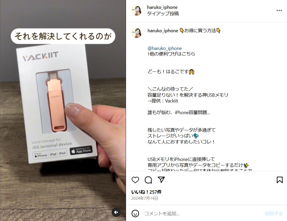 Vackiitの 「Apple MFi認証 」usbメモリは、SNS上で大きな注目を集め、総再生回数が100万回を超えている。この製品が注目されている理由のひとつは、iPhoneユーザーの容量不足を解消し、iCloudの利用料を削減できる点だ。