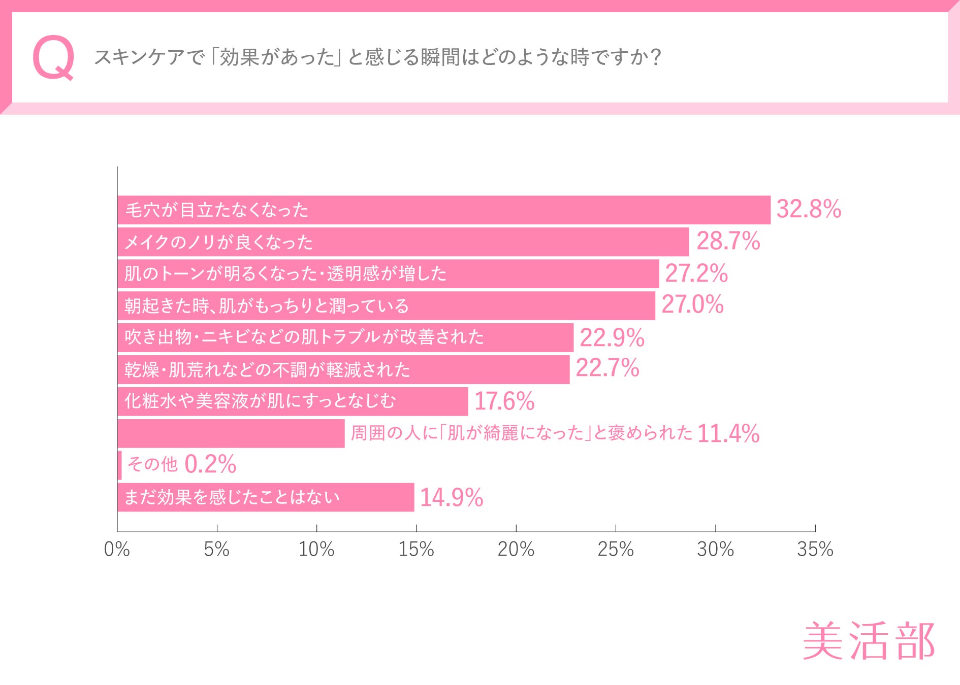 Q4 スキンケアで効果を感じる瞬間のトップは「毛穴が目立たなくなった」で 32.8%。続いて「メイクのノリが良くなった」 28.7%、「肌トーンが明るくなった」 27.2%。