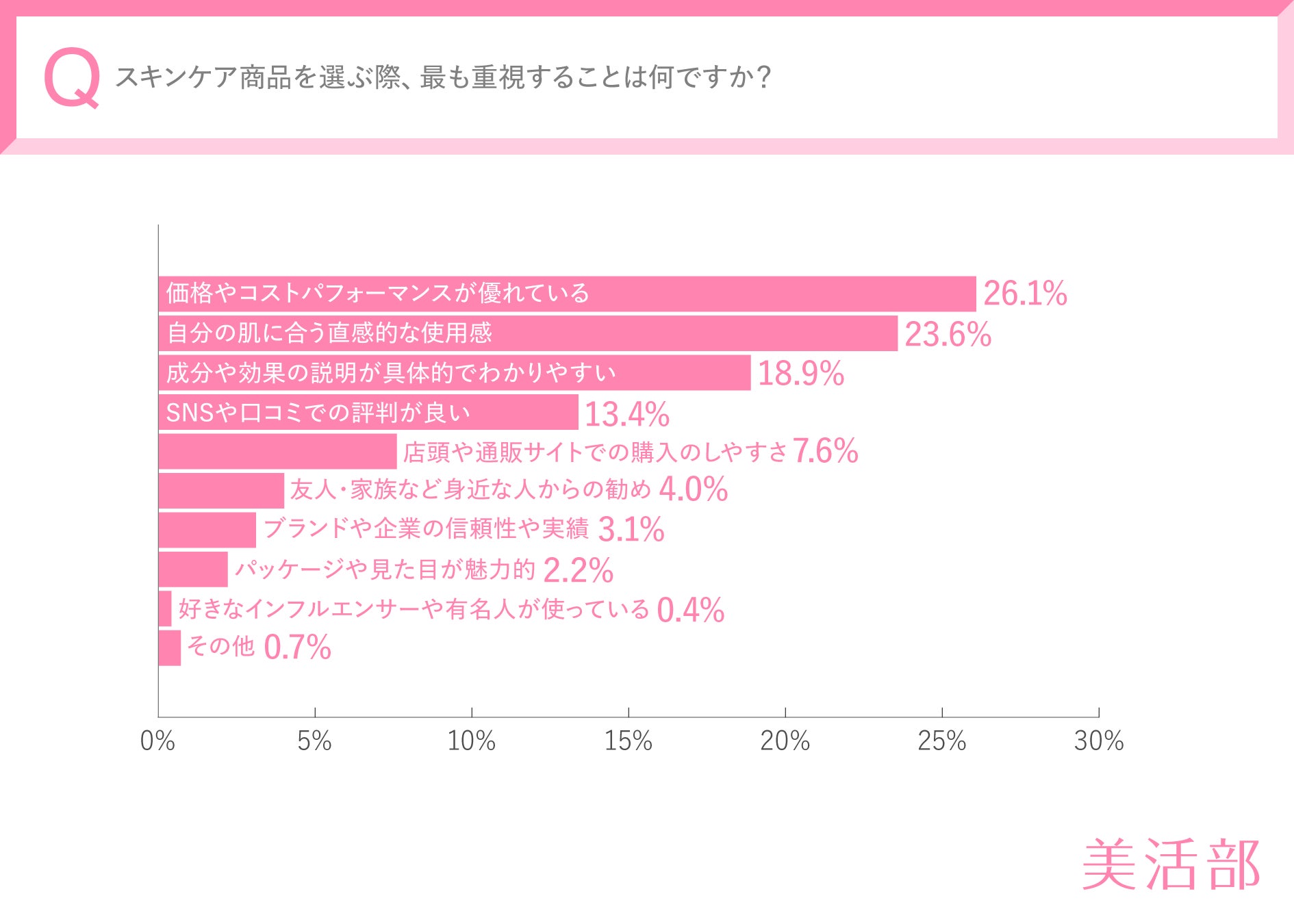 Q2 スキンケア選びで最も重視するポイントは「価格やコストパフォーマンス」で 26.1%。