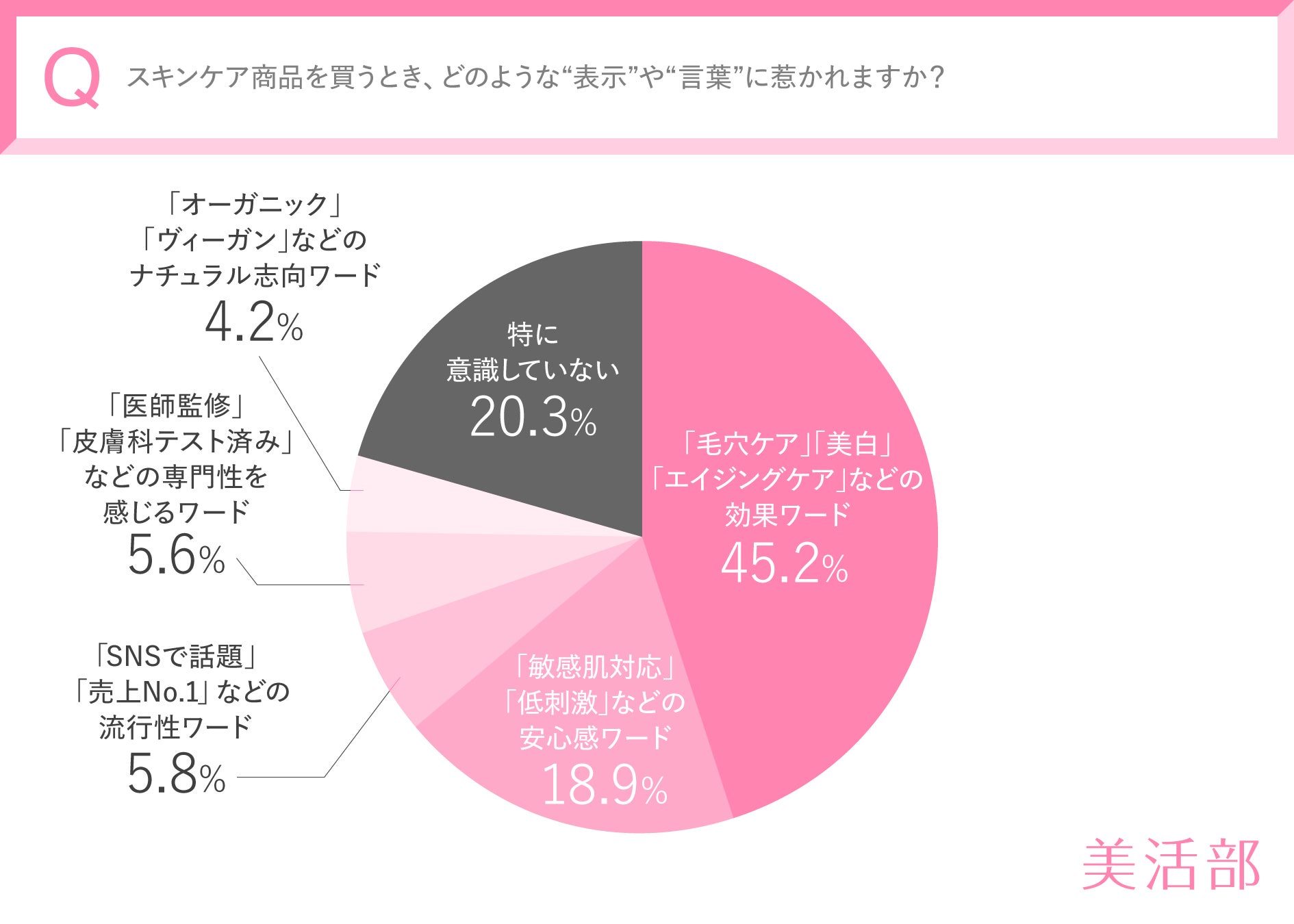 ①「毛穴ケア」「美白」「エイジングケア」などの効果ワード 45.2%