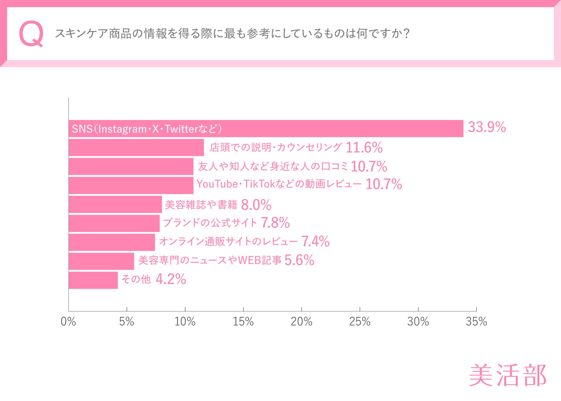 スキンケア情報源のトップは「SNS(Instagram・X など)」33.9%。スマホでの短尺コンテンツ消費が定着し、ハッシュタグ検索やストーリーが商品選択の入り口になっています。次点の「YouTube・TikTok などの動画レビュー」と「友人・知人の口コミ」がいずれも 10.7% と拮抗し、視覚的なビフォーアフターと身近な体験談への信頼が依然高いことがうかがえます。