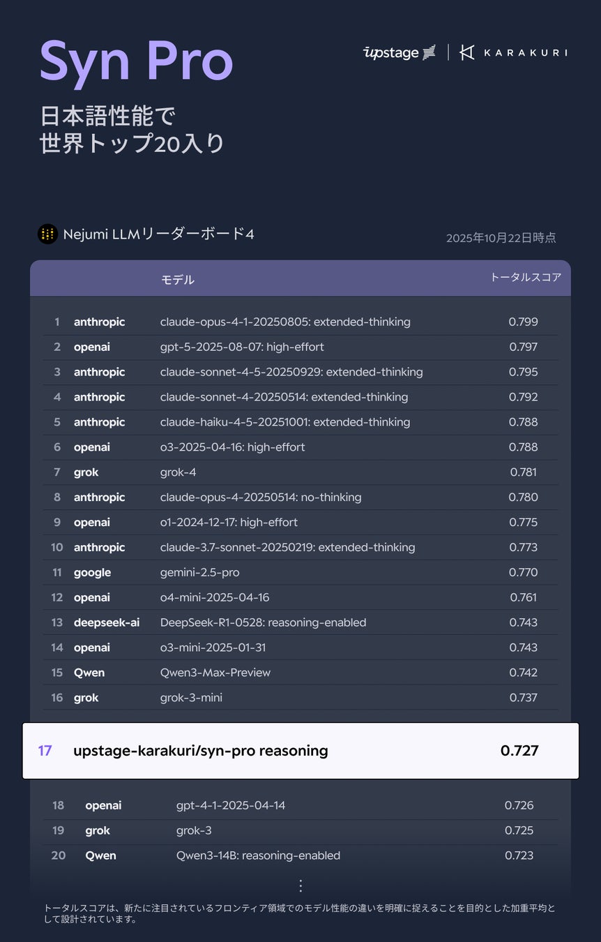 2025年10月23日、東京 — Upstage AI 株式会社(以下、Upstage)は、日本のAIの未来を切り拓く新たな一歩として、次世代型の日本語大規模言語モデル(LLM)「Syn Pro(シン・プロ)」を発表しました。本モデルは、日本のAI開発をリードするカラクリ株式会社と共同で国内開発されたものです。