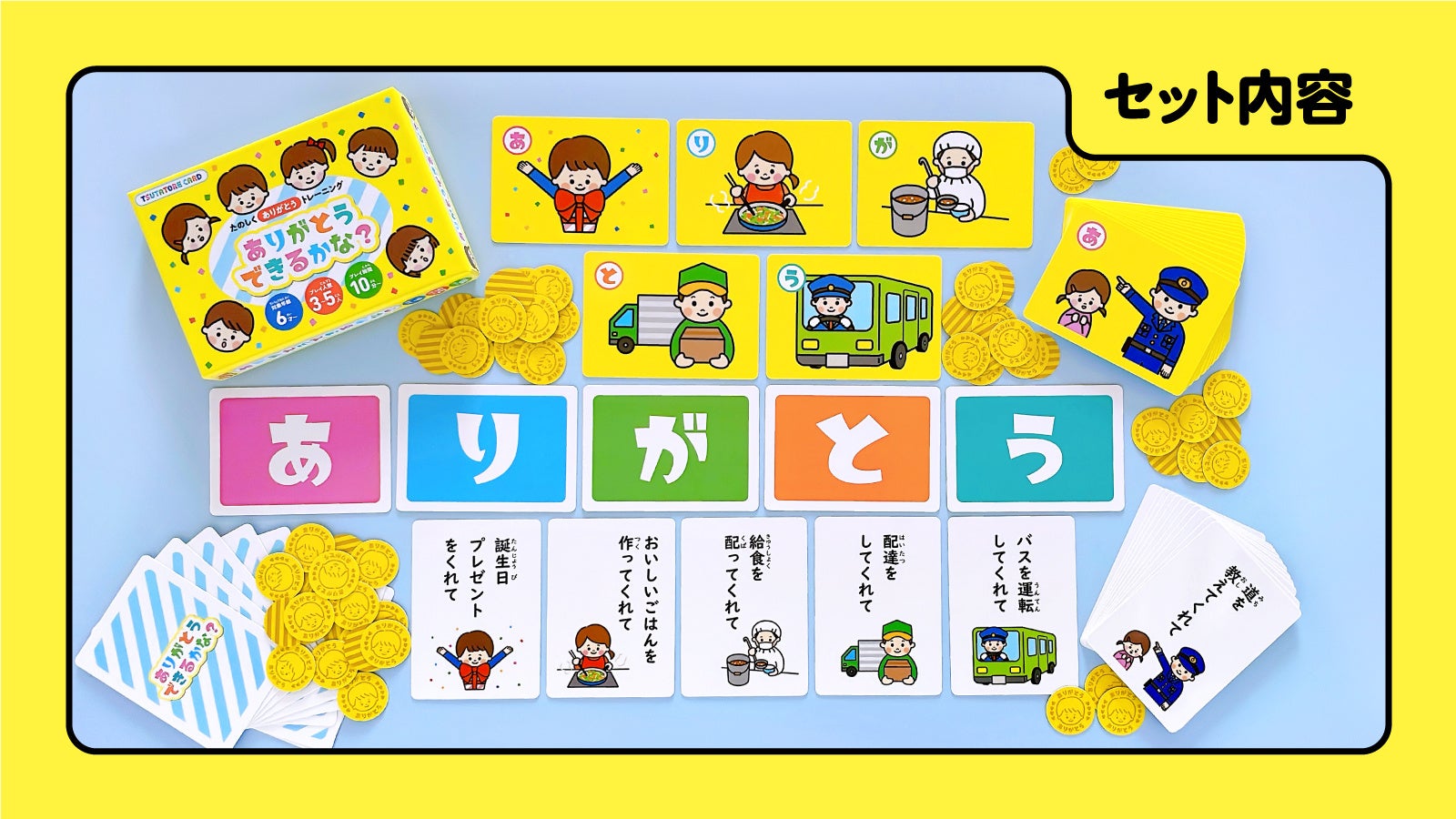 内容物:(通常セット)イラストカード25枚、ことばカード25枚、ありがとうコイン60枚、あそびかた説明書1枚