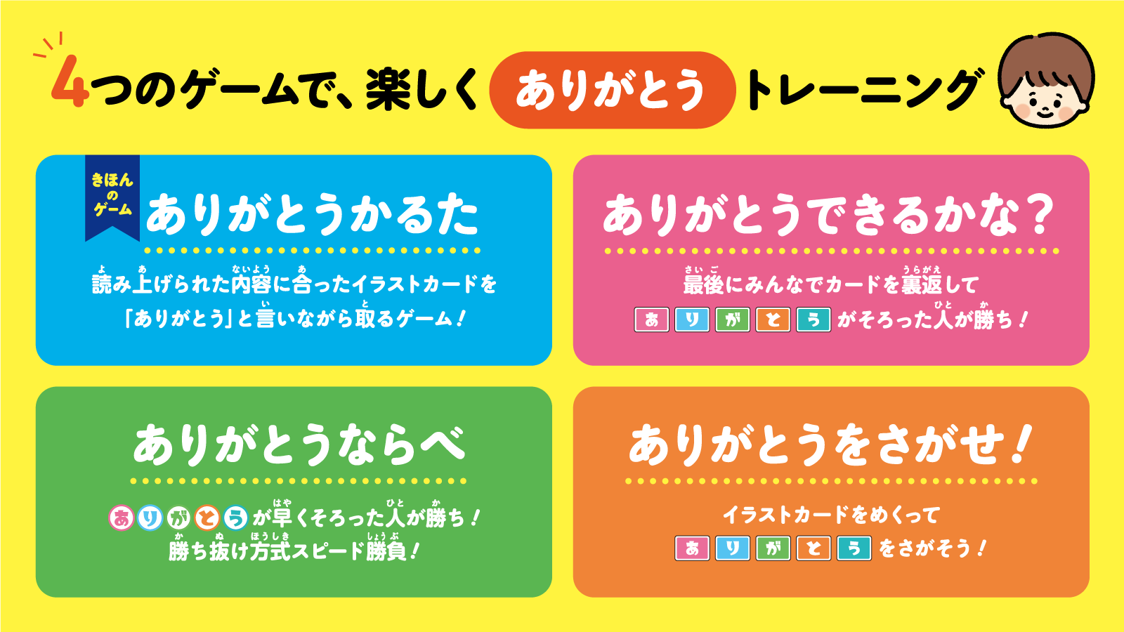 ありがとうをさがせ!:神経衰弱風の遊びで、文字をめくって「ありがとう」を完成させるゲーム。