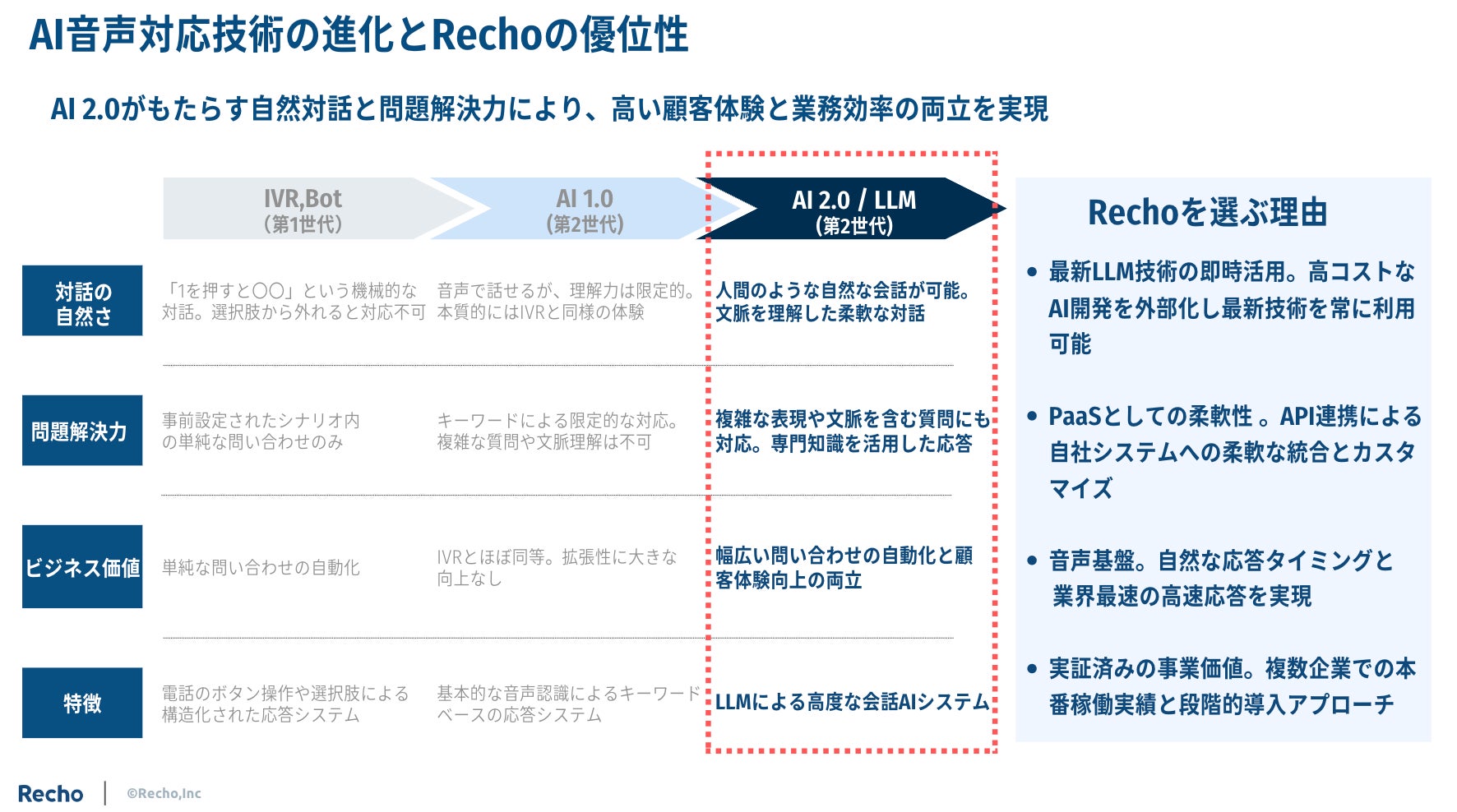 AI音声対応技術は大きく進化してきましたが、多くの限界も存在します。以下の表は、これまでの音声AI技術の世代別比較とRechoが提供する独自価値を示しています。