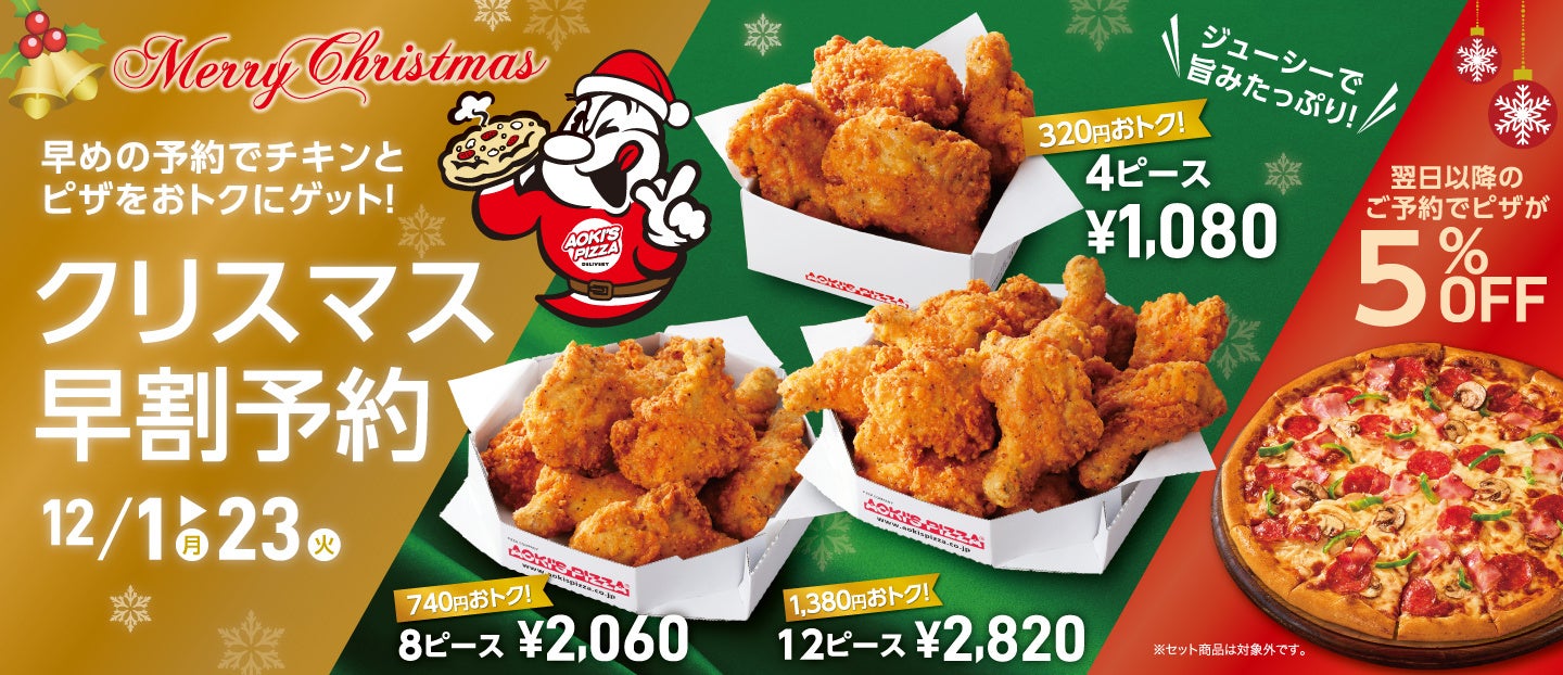 12月1日(月)〜23日(火)の期間中、クリスマス早割を実施いたします。フライドチキンとピザの最強コンビで、皆さまに笑顔あふれるクリスマスをお届けします。
