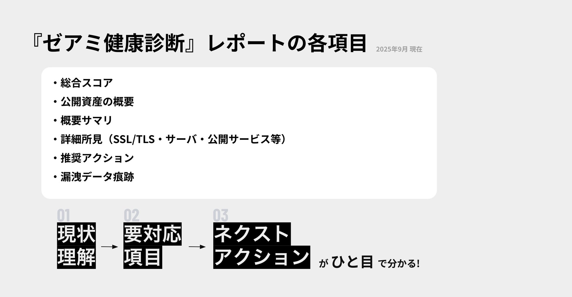 『ゼアミ健康診断』は 「経営層向けのわかりやすさ」と「技術担当者向けの深さ」を両立 したレポートで、診断から改善までを一気通貫で支援できるのが特徴です。