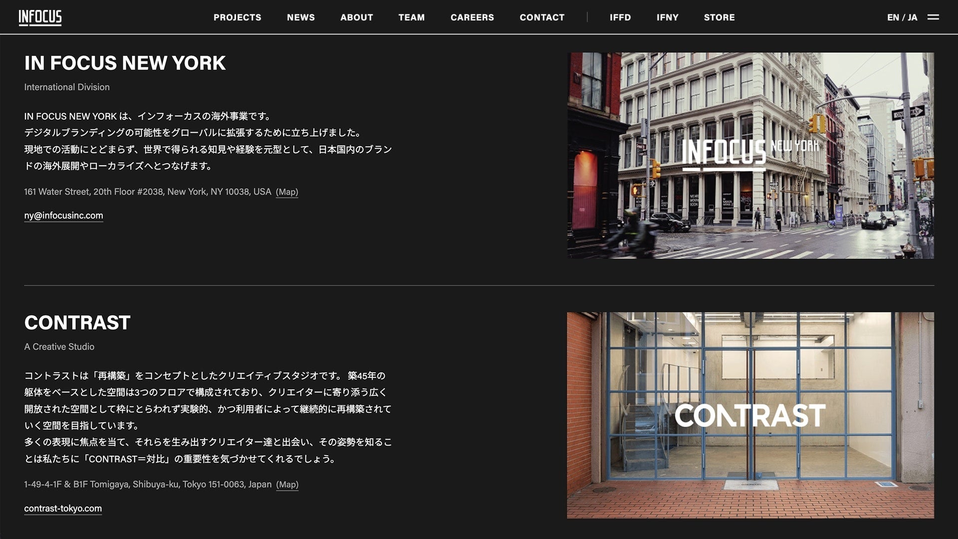 トップページでは新たな映像でインフォーカスの掲げる「デジタルブランディング」を可視化し、スタッフページや採用ページを再設計。昨年より開始した海外事業「IN FOCUS NEW YORK」のティザーサイトも新たに制作しました。
