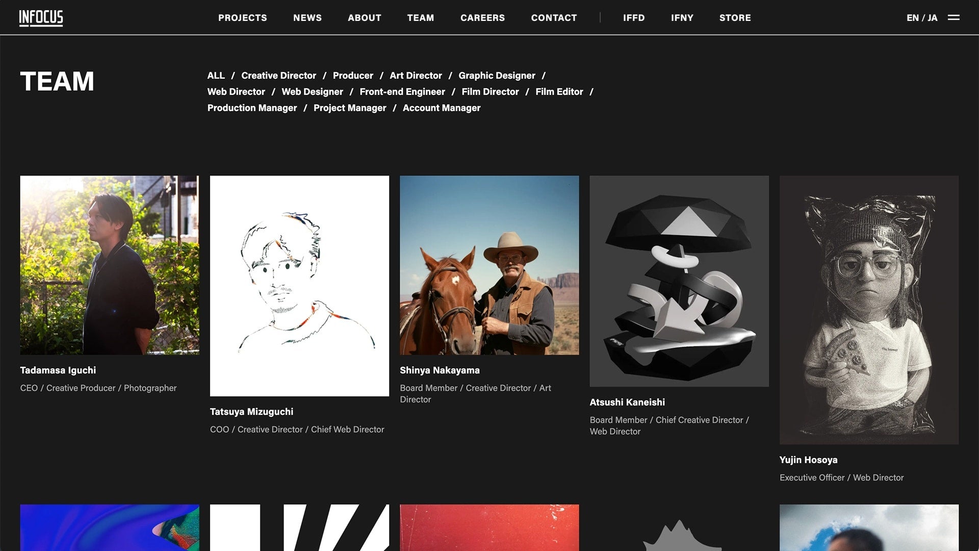 東京とニューヨークの2拠点にオフィスをかまえ、国内外を問わず多様なクライアントと協働し、新しい表現や価値を生み出していくこと。メンバー一人ひとりの成長が組織全体の成長につながり、積み重ねた実績がさらに広い世界へとつながっていくこと。こうした相乗効果を育みながら、時代や社会の変化、テクノロジーの進化を見据え、最適な表現を追求し続ける。それこそが、インフォーカスの目指す姿です。