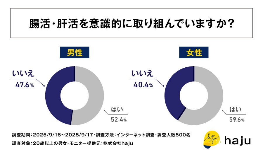 株式会社haju(本社:福岡県福岡市中央区高砂2丁目1−4 オーキッドプレイス天神南 8F/代表:大西 有恭)は、自社サプリブランド「肝活ガンマン」に関連して、年齢・性別がバラバラな全国の成人500名を対象に「肝活と腸活の意識比較」に関する実態調査を実施しました。