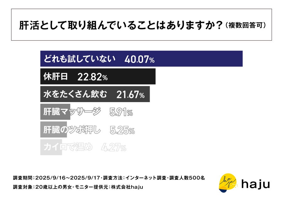 「肝活として取り組んでいることはありますか?」という設問に対して、最も多かった回答は「どれも試していない」(40%)で、肝活行動の定着がまだ低い現状が示されました。