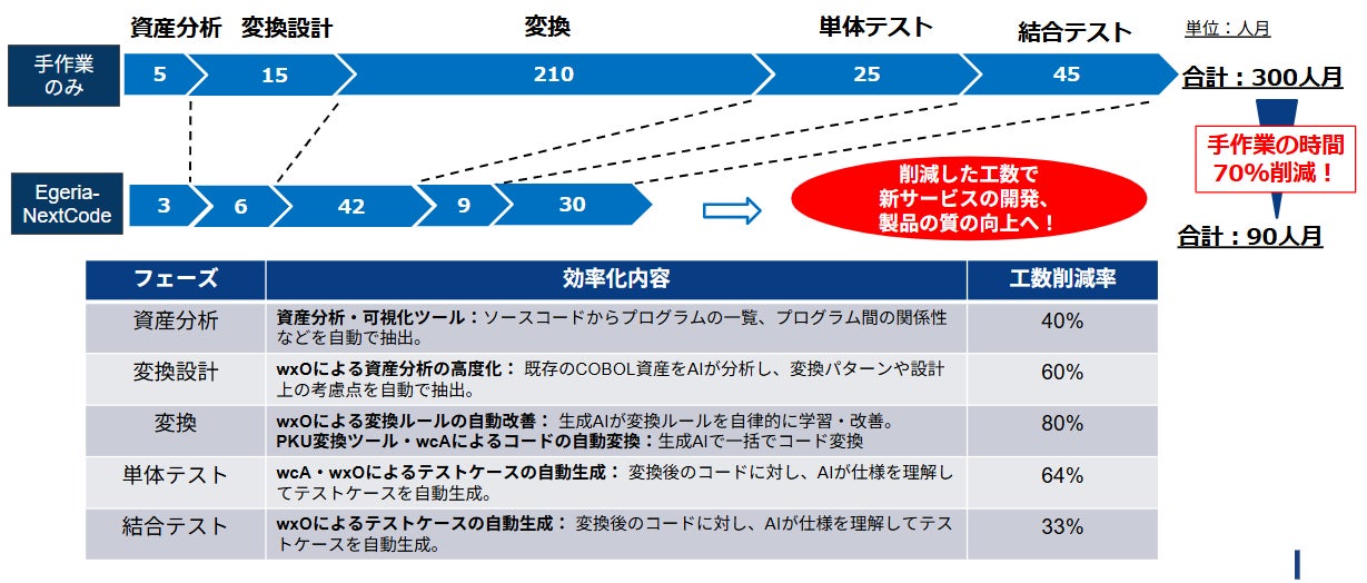 このように本AIソリューションはCOBOL資産の可視化から最新のJavaへの移行までを一貫してカバーできるため、本AIソリューションを導入する企業や機関は、従来の生成AIでは難しかった独自COBOLの正確かつ高精度な変換と、ドキュメント作成やコード変換の大幅な効率化を図ることができます。また、手作業と比較し、マイグレーション業務にかかる移行工数をおよそ70%削減できる見込みです。結果、保守不能となっていた老朽化システムを、柔軟かつ継続的に活用可能な新しい資産へと再構築することが可能となります。